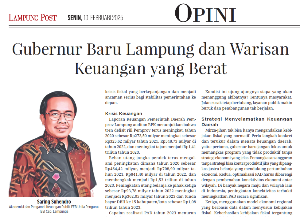 Dalam hitungan hari, Mirza-Jihan akan memimpin Lampung. Tapi mereka tak ada waktu untuk bersantai. Warisan keuangan daerah yang berat berupa defisit riil makin melebar, utang menumpuk, dan pendapatan daerah justru melemah. Jika tidak dibenahi akan menjadi bom waktu yang berisiko semakin terjebak dalam krisis fiskal yang berkepanjangan dan menjadi ancaman serius bagi stabilitas pemerintahan ke depan.